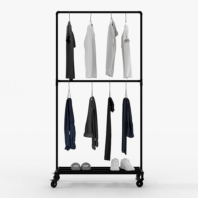 Transform your space with the Two-Tier Industrial Pipe Clothing Rack, a stylish and functional solution for your storage needs. Designed with a sleek, modern industrial aesthetic, this metal clothing rack features two spacious tiers for hanging garments and an integrated shoe shelf for additional convenience. Whether you’re organizing your bathroom, living room, or entryway, this rack’s durable construction makes it perfect for a variety of uses.